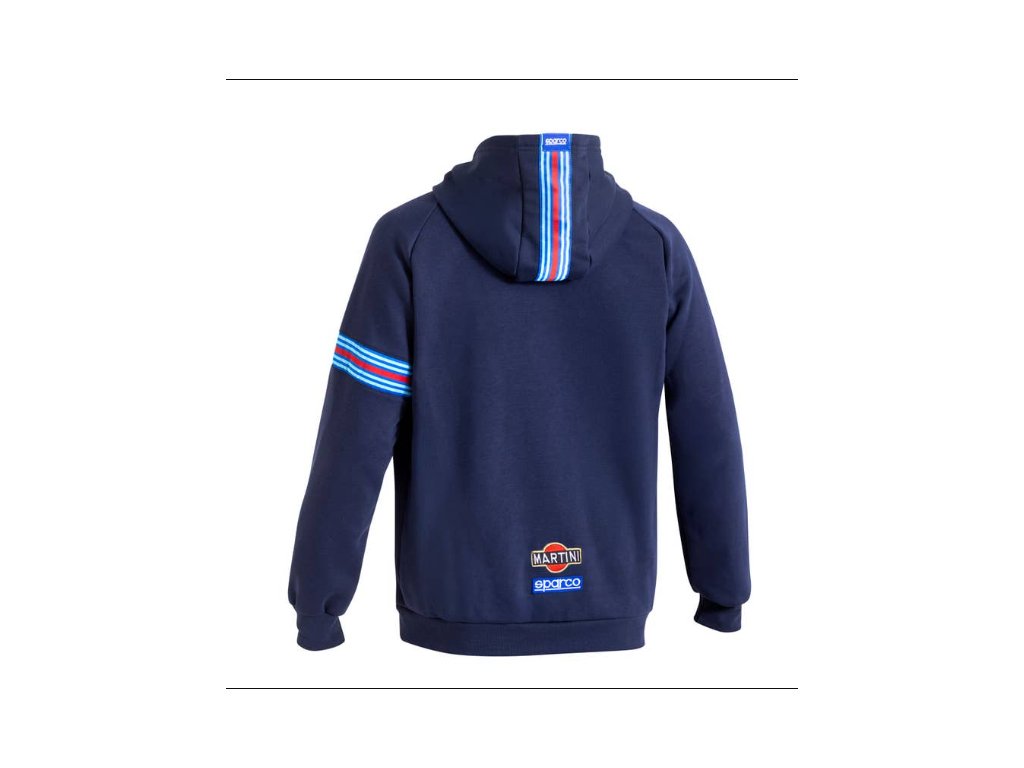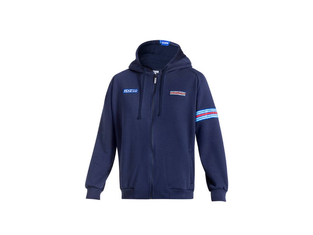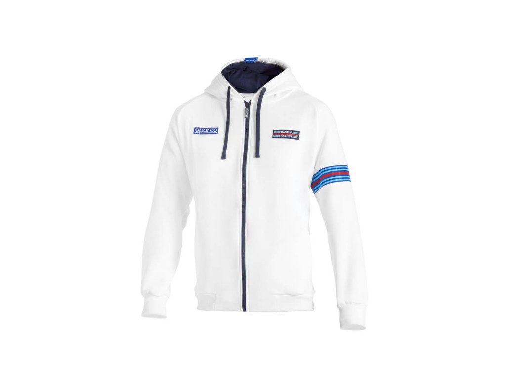 Mikina s kapucí a zipem, zdobená úpravami Martini Racing v podobě nášivek a tkaných pruhů.