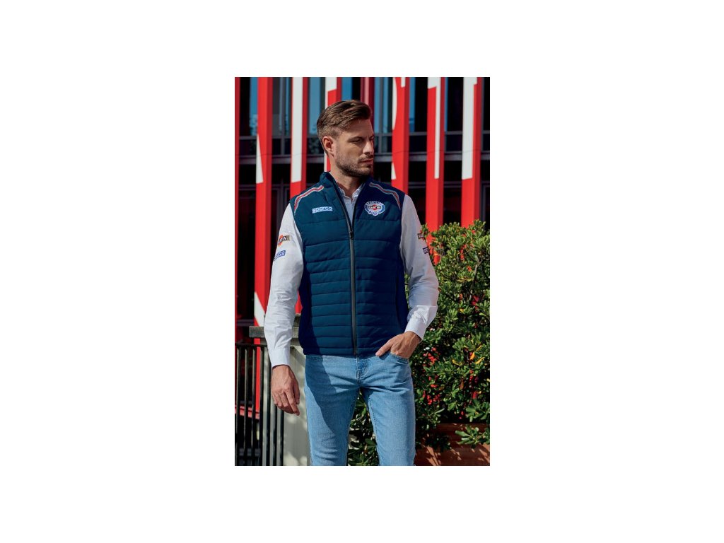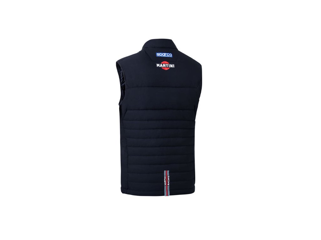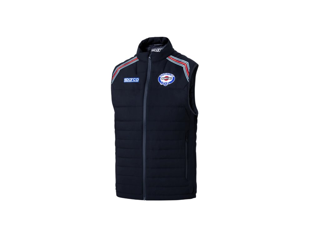Vesta v designu MARTINI RACING s vyšívanými logy, vyrobená z technického materiálu.